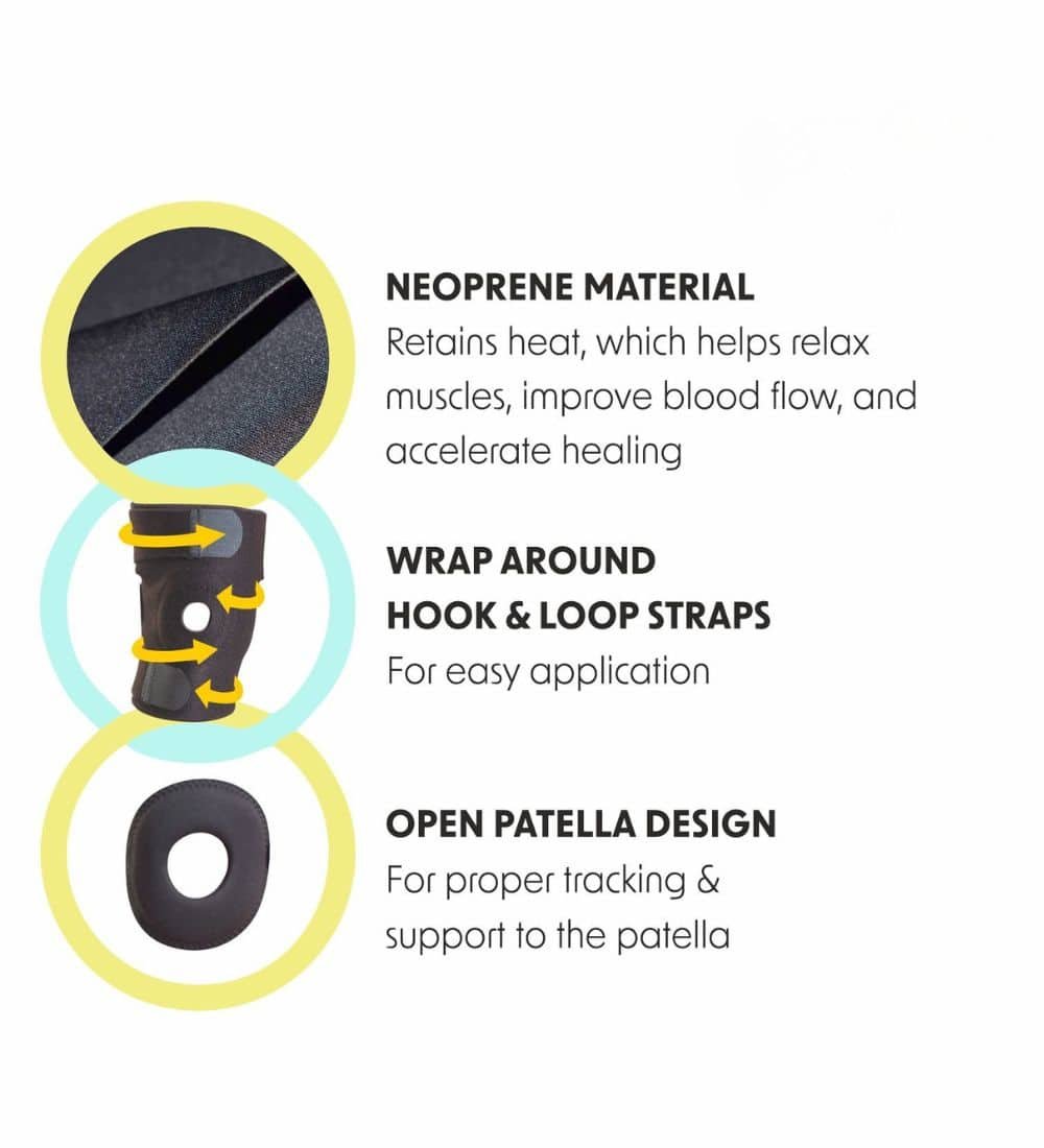 Universal Size: Neoprene Material: Wrap-Around Design: Open Patella Design: Ergonomic Fit: